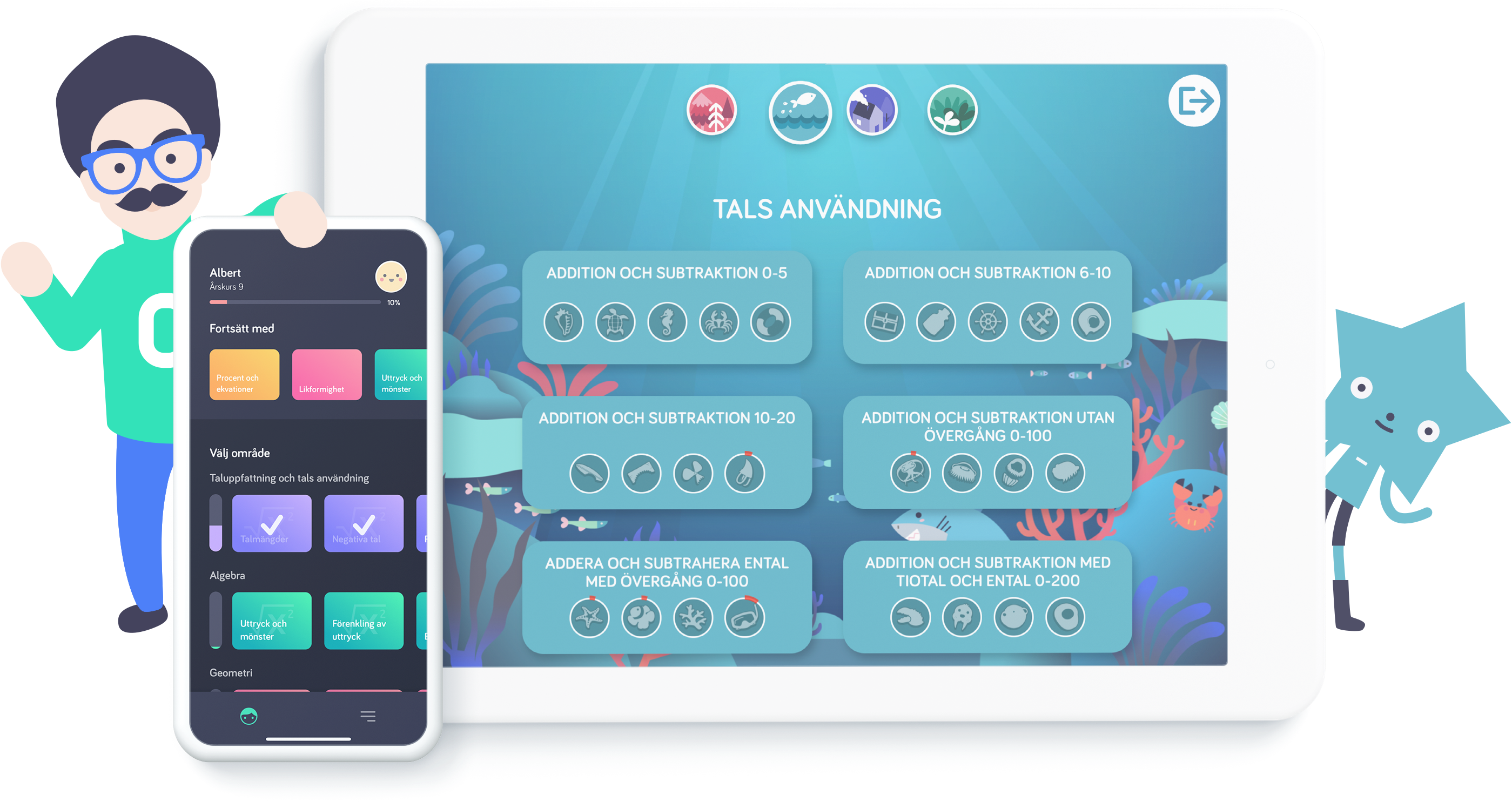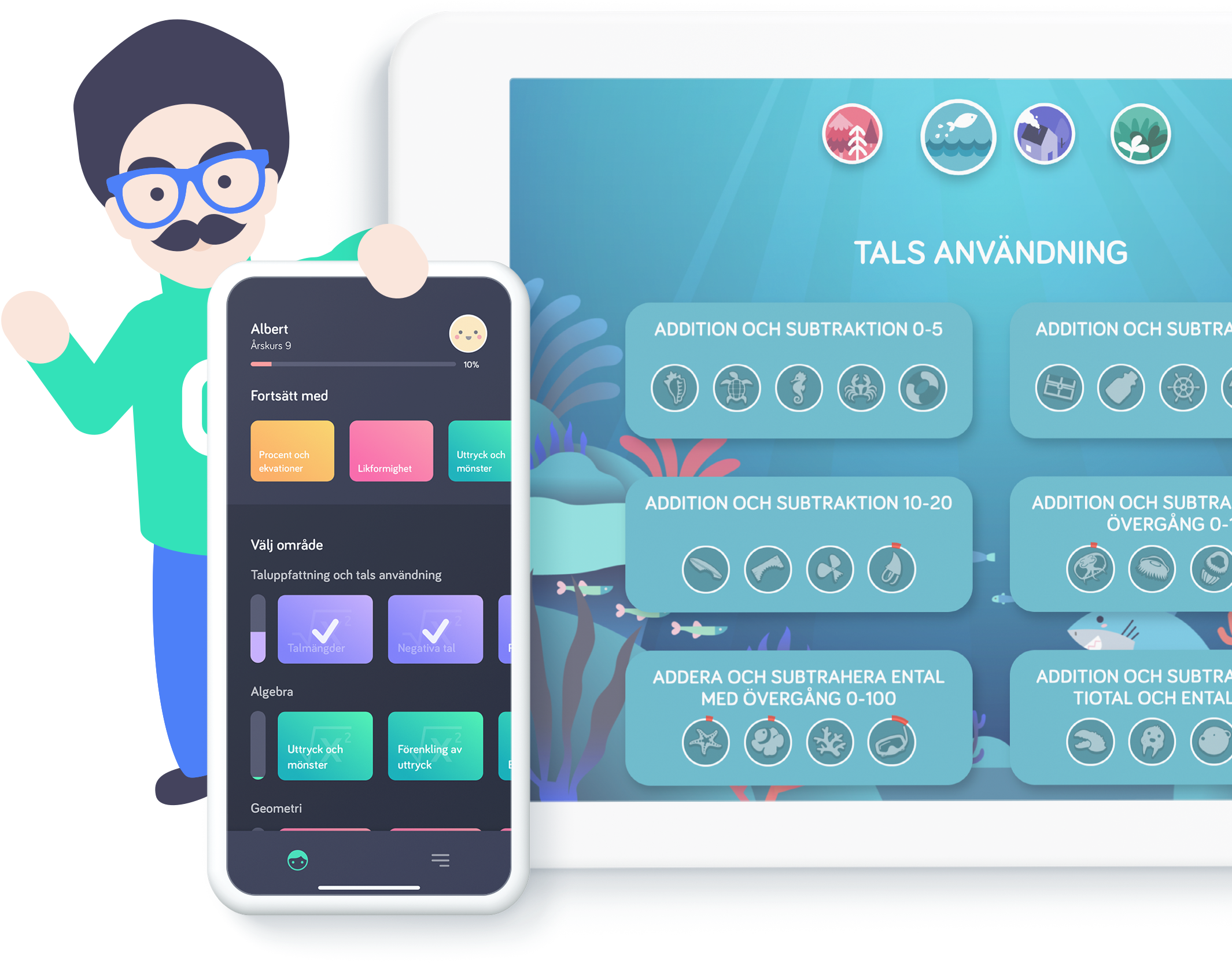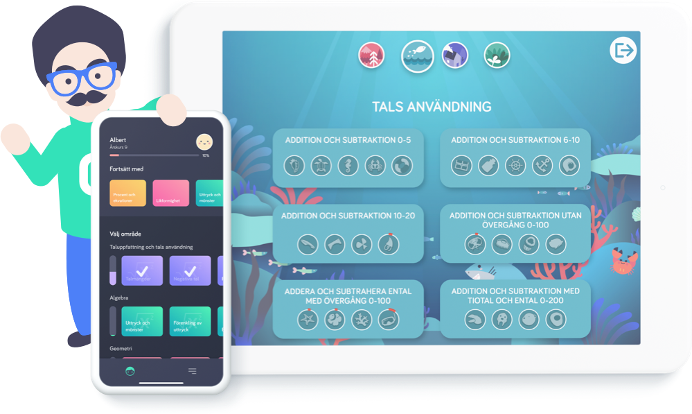 Albert är Barnens Digitala Mattelärare. Han hjälper dig steg-för-steg med alla